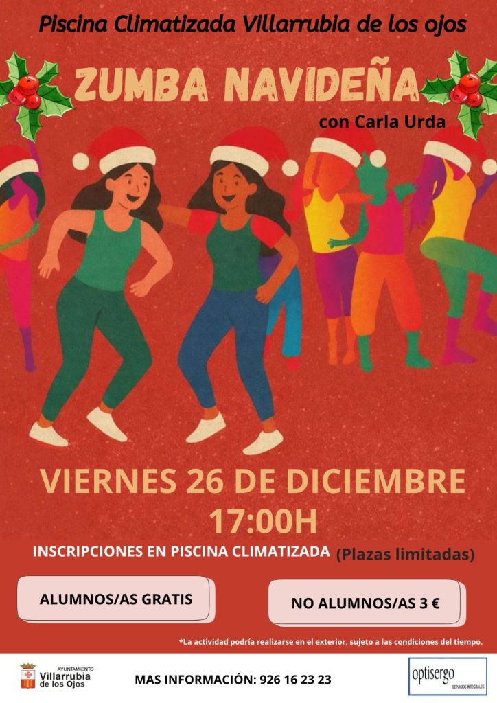 Antes a las 17 horas de este mismo día 26, habrá Zumba Navideña en la Piscina Climatizada, a cargo de Carla Urda, para lo que habrá que inscribirse en la misma piscina, y con plazas limitadas. Para los alumnos-as, será gratis la inscripción y para el resto deben pagar 3 euros. Para más información, llamar al teléfono 926 162323.